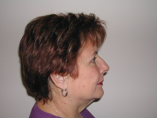 Postoperatively, her grandson commented that her eyes looked more open. That is readily apparent on the anterior view. The lateral view shows the improvement in the contour of the lower lids. The postop photos were taken six weeks after surgery.