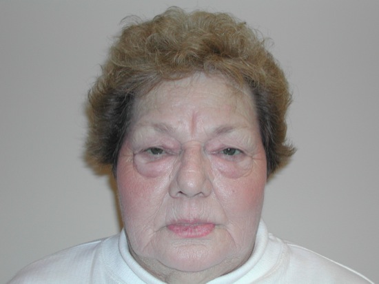 This patient is a woman in her early seventies whose vision was obstructed by her eyelids. When she tried to look up, the upper eyelids covered her pupils (a condition called ptosis). When she tried to look down, all she could see was the bags on the lower eyelids.